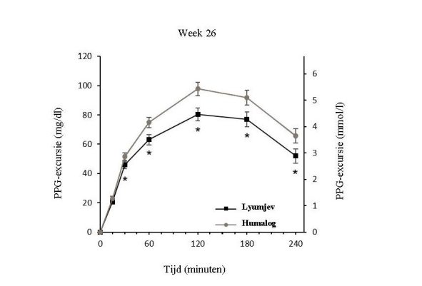 Lyumjev is een maaltijdinsuline voor subcutane injectie en dient 0 tot 2 minuten vóór het begin van de maaltijd te worden toegediend met de mogelijkheid tot toediening tot maximaal 20 minuten na het begin van de maaltijd (zie rubriek 5.1).