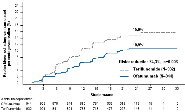 In de klinische fase III-studies naar RMS, was het totaal aantal infecties en ernstige infecties bij patiënten behandeld met ofatumumab vergelijkbaar met patiënten die behandeld werden met teriflunomide (respectievelijk 51,6% vs. 52,7% en 2,5% vs. 1,8%). Twee patiënten (0,2%) stopten met de studie en 11 patiënten (1,2%) onderbraken tijdelijk de studiebehandeling vanwege een ernstige infectie.