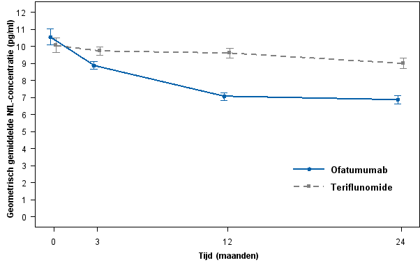 Ofatumumab werd geassocieerd met een tijdelijke daling met 4,3% van de gemiddelde immunoglobuline G (IgG)-spiegel na 48 weken behandeling, maar met een stijging met 2,2% na 96 weken.