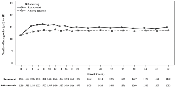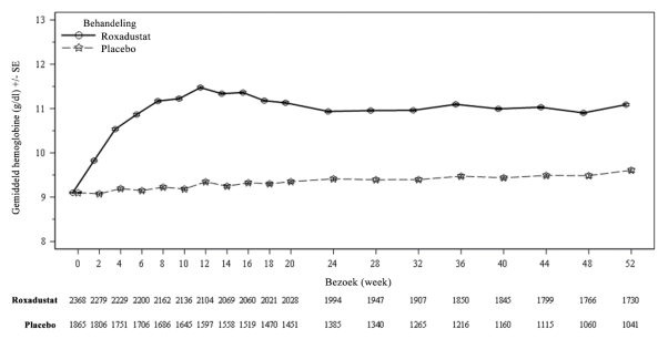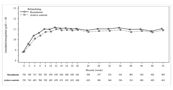 De dosering roxadustat mag niet vaker dan eens per 4 weken worden aangepast, tenzij het Hb-gehalte op enig moment binnen een periode van 4 weken met meer dan 2 g/dl toeneemt. In dat geval dient de dosering onmiddellijk met één stap te worden verlaagd. | ||||