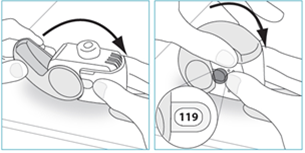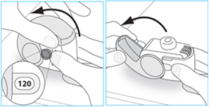 - Het venster van de dosisteller moet op “120” staan. Als het weergegeven cijfer lager is dan “120”, moet de patiënt de inhalator terugbrengen naar de persoon die hem heeft gegeven en een nieuwe vragen.