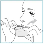 4. De patiënt dient krachtig en diep via de mond in te ademen. Het kan zijn dat hij/zij iets proeft of een klikje hoort of voelt wanneer hij/zij de dosis inneemt.
