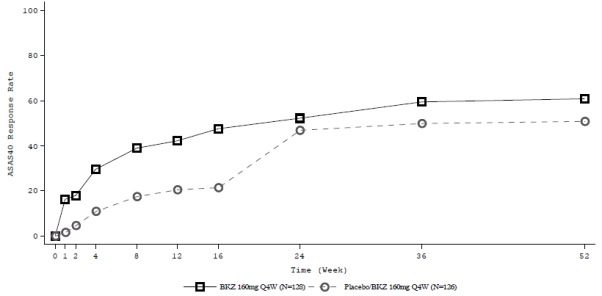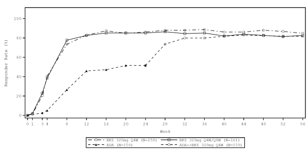 BKZ 320 mg Q4W = bimekizumab elk 4 weken; BKZ 320 mg Q8W = bimekizumab elke 8 weken; ADA = adalimumab.