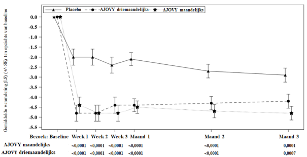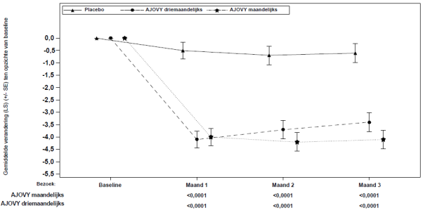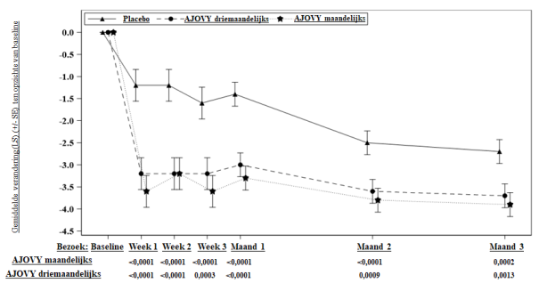 Gemiddelde bij baseline (maandelijkse gemiddelde aantal migrainedagen): placebo: 14,4; AJOVY driemaandelijks: 14,1; AJOVY maandelijks: 14,1.