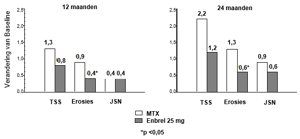 Het is gebleken dat Enbrel, zowel op zichzelf gebruikt als in combinatie met methotrexaat, de progressiesnelheid van gewrichtsschade, zoals deze door middel van röntgenonderzoek gemeten wordt, reduceert en het lichamelijk functioneren verbetert.