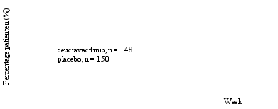 Het percentage infecties in de deucravacitinibgroep nam tot en met week 52 niet toe (95,4 voorvallen per 100 persoonjaren). Het percentage ernstige infecties in de deucravacitinibgroep nam tot en met week 52 niet toe (1,7 voorvallen per 100 persoonjaren).