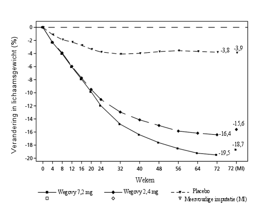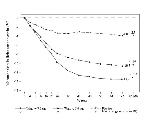 In overeenstemming met de mogelijk immunogene eigenschappen van geneesmiddelen die eiwitten of peptiden bevatten, kunnen patiënten na behandeling met semaglutide antilichamen ontwikkelen. Het aandeel van patiënten dat positief testte op antilichamen tegen semaglutide op een willekeurig tijdstip na aanvang van de studie was 2,9 – 10,9% voor semaglutide 2,4 mg en 15,3% voor semaglutide 7,2 mg. Geen van de patiënten had neutraliserende antilichamen tegen semaglutide of antilichamen tegen semaglutide met endogeen GLP-1-neutraliserend effect. Het is mogelijk dat tijdens de behandeling hoge semaglutideconcentraties de gevoeligheid van de assays hebben verminderd; het risico van fout-negatieve uitslagen kan dus niet worden uitgesloten. Bij patiënten met een positieve testuitslag voor antilichamen tijdens en na de behandeling was de aanwezigheid van antilichamen echter van voorbijgaande aard en had deze geen waarneembaar effect op werkzaamheid en veiligheid.