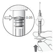 Dosis instellen | 11. Houd de spuit op ooghoogte en druk de zuiger voorzichtig in totdat de rand onder de top van de rubber stop zich op één lijn bevindt met de doseringsstreep (zie Figuur 7). Hierdoor zal de lucht en het teveel aan oplossing verwijderd worden en de dosis op 0,05 ml worden ingesteld. |
